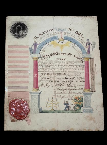 Providing the appearance of a fine Regency drawing room interior, the design of a rainbow arch above the Master’s chair may indicate the Lodge room also served for Royal Ark Mariner ceremonies. The Lodge obtained a Charter for Royal Arch ceremonies and George Salisbury was exalted in the Chapter on 30 December 1822. A private Royal Arch certificate for Chapter member John Clifford designed by Salisbury survives in the Museum collections today as you can see below.