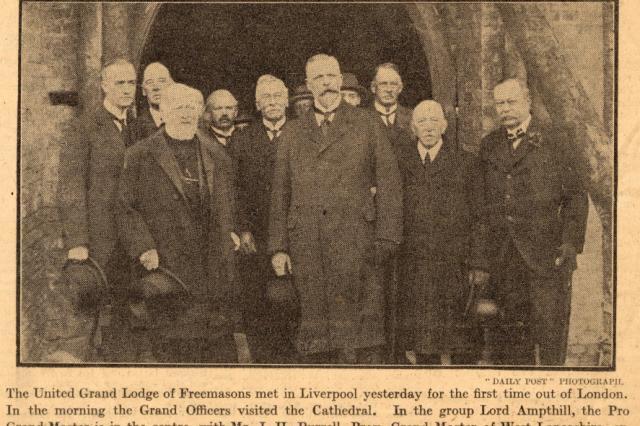 The meetings were successful in bringing Provincial freemasons to Quarterly Communications but they also helped to raise the profile of freemasonry. Alfred Robbins had a background in journalism and was keen to keep freemasonry in the press for positive reasons. The Liverpool meeting attracted plenty of coverage with the Liverpool based Daily Courier reporting that the Mayor of Liverpool entertained the officers of Grand Lodge at the Walker Art Gallery and that West Lancashire was the largest masonic Province. Both the Liverpool Daily Post and the Daily Mail carried pictures of Lord Ampthill visiting stonemasons at Liverpool Cathedral and The Times reported on the earthquake relief fund discussed at the meeting.