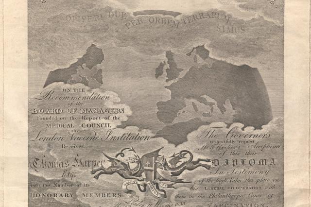 Numerous supporters funded the Institution, which distributed the vaccine to doctors world-wide, with detailed instructions about the inoculation technique. In return, donors received a richly decorated diploma as an honorary member, such as this one given to the active freemason and jeweller, Thomas Harper, in March 1830.